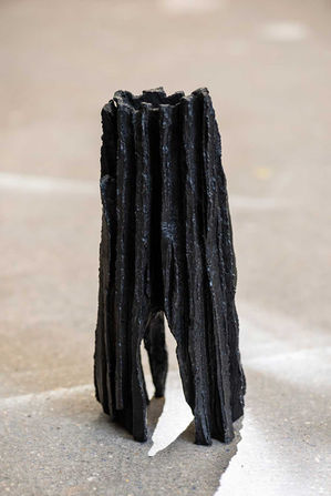 Du paysage naturel au territoire intérieur, il n’y a qu’un pas. Encore une histoire de glissement, de failles. Les pièces de la céramiste racontent une histoire du temps, celle du monde, mais aussi celle de chaque humain, dont la destinée est faite de fêlures, de traces, de cicatrices. Chaque sculpture essaie de capturer cette fuite, ce passage, ces étapes et transitions qui sont l’histoire de nos vies. Tantôt brutes, tantôt brillantes, les œuvres explorent des territoires, où apparences et profondeurs de la matière se rencontrent. Terres noires et terres blanches sont sollicitées, travaillées, cuites ou livrées à leur propre évolution. Terre noire chamottée, figée par un geste final, une patine. Terre blanche gardée à l’état brut, libre, soumise au travail du temps.